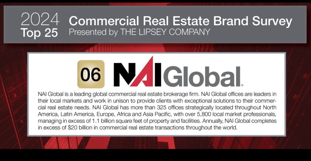 Jackson, MS – March 1, 2024: NAI Global, a leading, global commercial real estate firm, earned the top sixth spot in the 2024 Lipsey Survey of Top 25 Commercial Real Estate Brands. The survey was conducted among 100,000 commercial real estate professionals using a combination of ballot voting, phone interviews and focus groups to identify the top global brands. NAI UCR Properties is an Office of NAI Global.